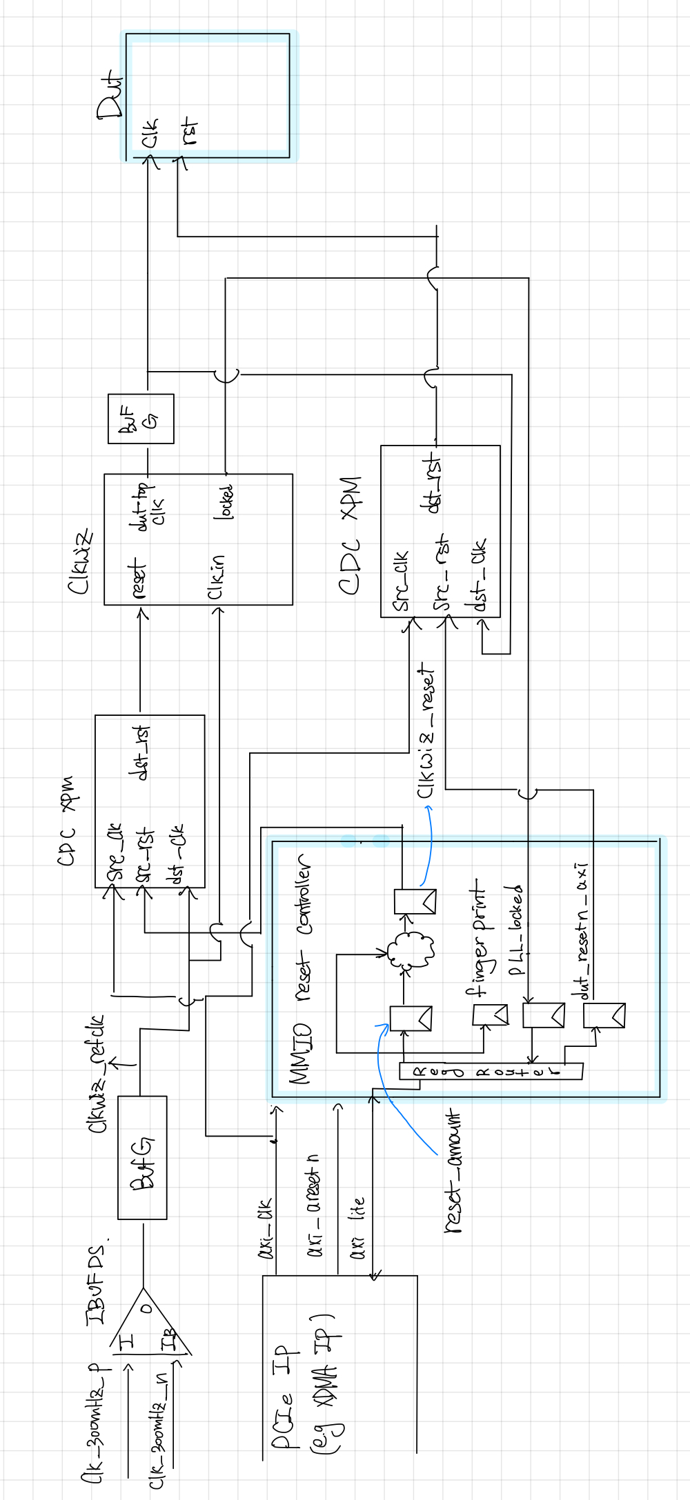 Ideally, we should be able to read the locked signal, control how long the reset signal must be hold high, and control the value of src_rst and the dut_resetn_axi (which will reset the DUT) in software. This enables us to have confidence that the PLL is locked. Furthermore, in cases when the PLL is not locked, we can change the reset duration and send a reset signal to clkwiz again, without having to reprogram the FPGA.